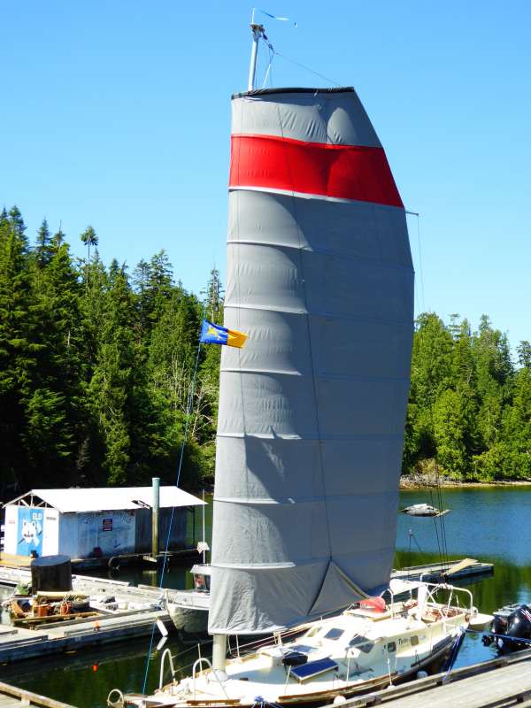 I 've been sailing with my new wing sail on the W coast of Vancouver Island; not much sea time yet, but it 's looking promising. This is a single sail of 54 sq m, as opposed to the ketch rig with wing sails that I sailed with on Tystie for 40,000 miles.