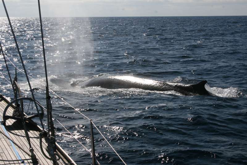 Suddenly I had company. More than I wanted. The first whale to exhale and show its presence was no more than thirty metres away on the port side. The second whale was about twenty-five metres away and moving determindly towards us. The third whale was on the starboard side about twenty metres away. There were probably another seven or eight as closely grouped ahead and astern. Morgan Le Fay was in the middle. These were fin whales. Huge leviathans over fifteen metres long. Capable of damage. Capable of capsizing a yacht. Each individual animal was heavier than my yacht. These animals, probably peaceful, can be clumsy in their curiousity. But were they being defensive? Did they know that we were a yacht and meant no harm? Or were we perceived as a threat? I switched on the engine and the echo-sounder and hoped that they would go away. They did. My reaction to the first encounter was slight worry, my reaction to the second was of considerable concern. Hope this helps. Regards Allan Collison (OCC) 'Morgan Le Fay '
