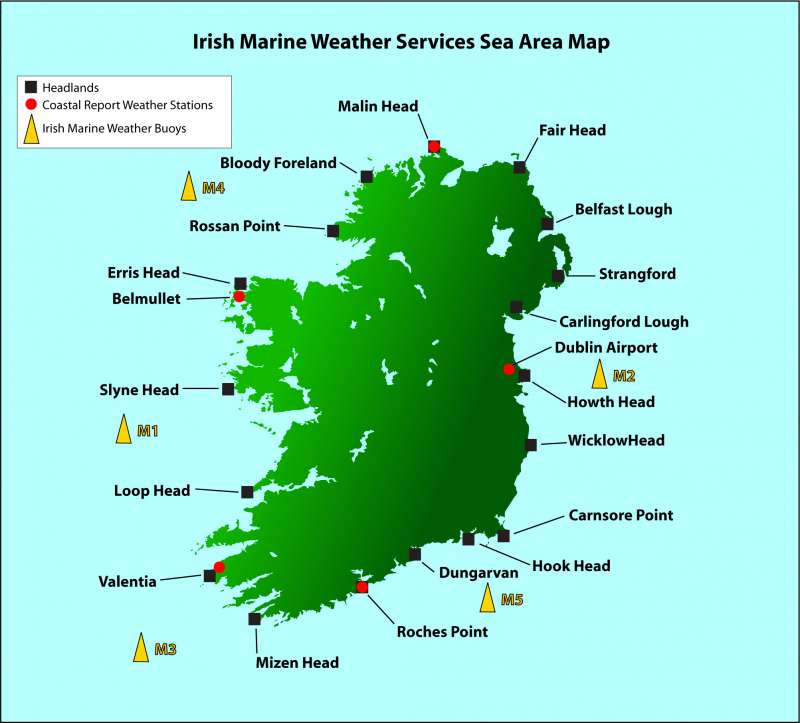 To interpret the weather forecasts for Ireland, which are delivered regionally, one must know where all the named headlands are. Below is a map we created for that purpose.
