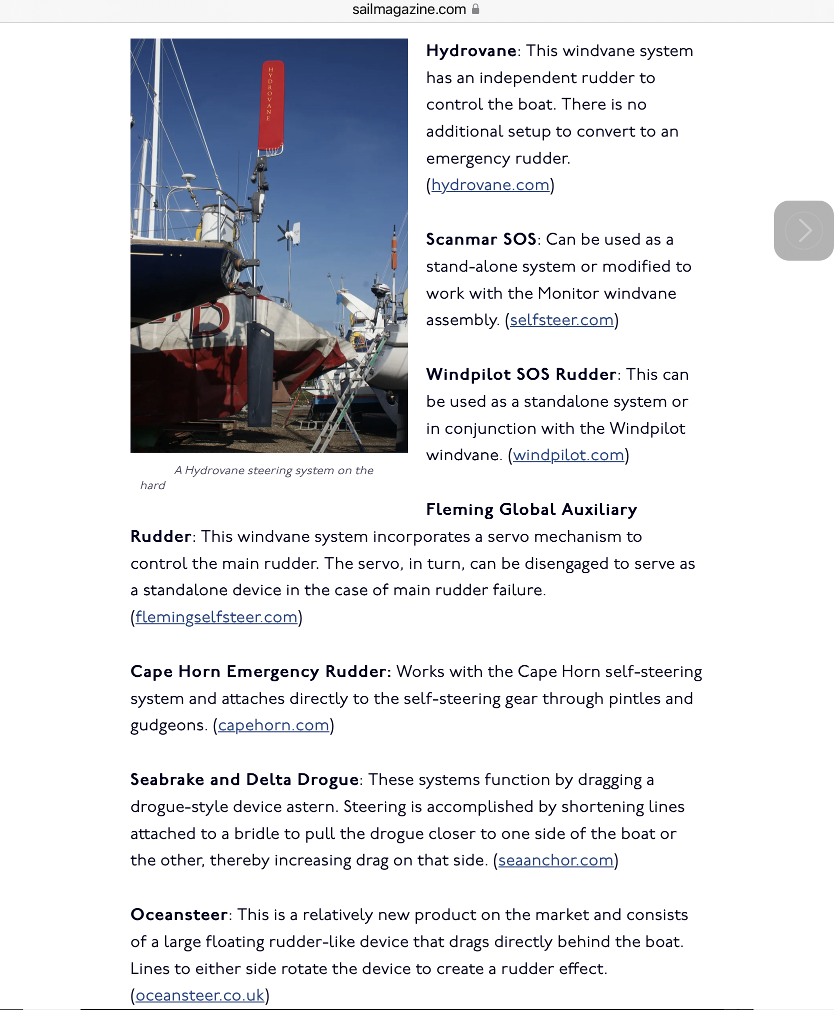 NB Just to clarify the considerations for my Windvane choice include my limited budget and include my safety need for an emergency rudder. Plus, I am restricted by Salacia’s Hanse385 lowering platform transom design, requiring an off-centre installation. So, I consider all off-centre wind-vane options, as I may decide to use a “soft emergency rudder” option; For example, I have been kindly offered the opportunity of purchasing a pre-sailed Windpilot and investigate Windpilot’s SOS rudder option. However, I have attached a ‘Sail magazine” cutting with a link to their article about, “Know how to rig an emergency rudder”… https://www.sailmagazine.com/diy/know-how-rigging-emergency-rudders